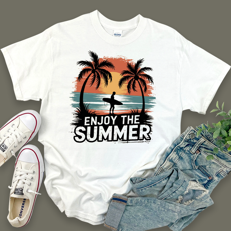 Stay cool and stylish this summer with our 'Enjoy the Summer' graphic top! Featuring surfers, sea, coconut trees, and a beautiful sunset design, this t-shirt is perfect for beach days or casual outings.