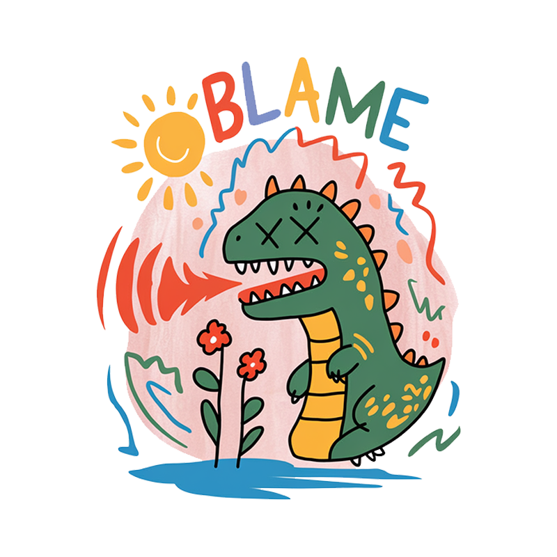 A quirky T-shirt featuring a funny dinosaur pattern with the word 'blame'.