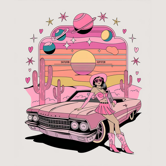 Retro Pink Aesthetic Graphic T-Shirt with Vintage Car and Planet Design