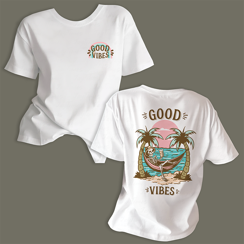A vibrant 'GOOD VIBES' t-shirt featuring a unique double-sided print with elements of a skeleton, beach, coconut tree, and hammock.