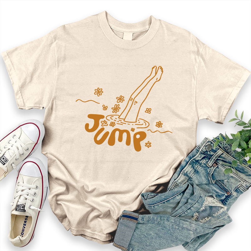 A stylish 'Jump' T-shirt featuring floral and diving elements, perfect for casual holiday wear.
