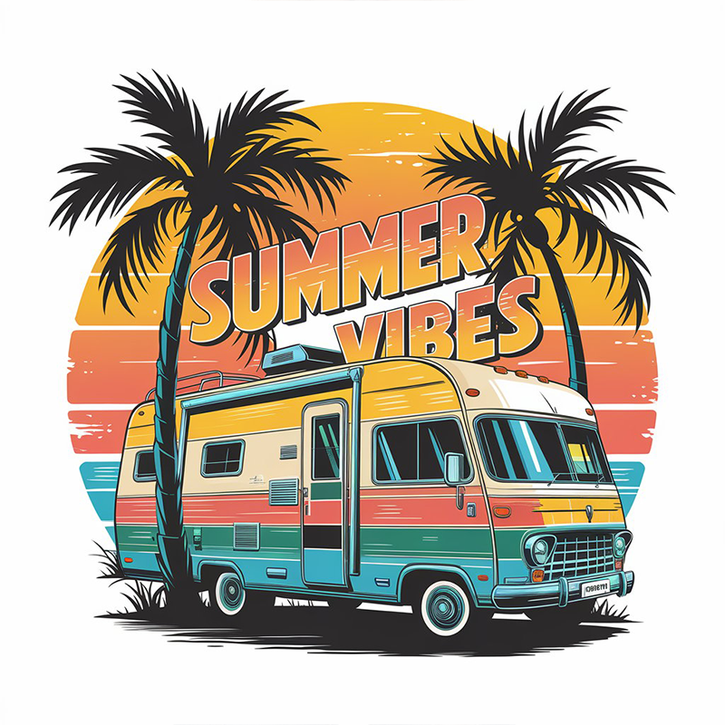 Experience the 'Summer Vibes' with this stylish t-shirt featuring elements of a bus, palm trees, and a sunset.