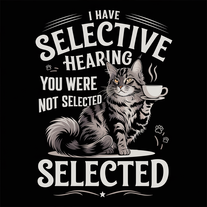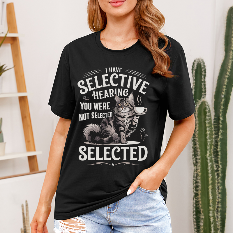 A stylish t-shirt featuring a unique 'I have selective hearing, sorry, you were not selected' design with elements of cats, letters, and coffee.