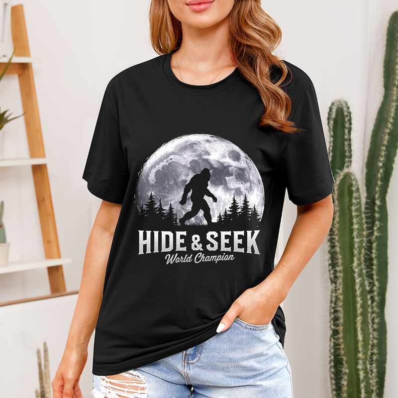 A unique 'Hide and Seek World Champion' t-shirt featuring elements of Bigfoot, forest, and letters.