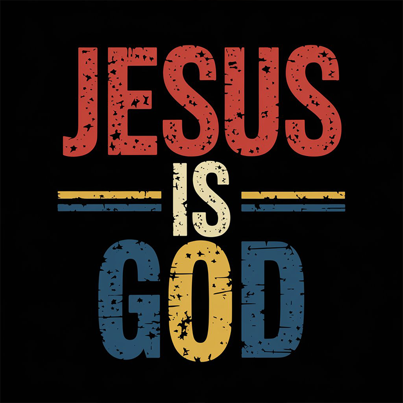 A stylish t-shirt featuring a fun letters pattern and the statement 'Jesus is God'.