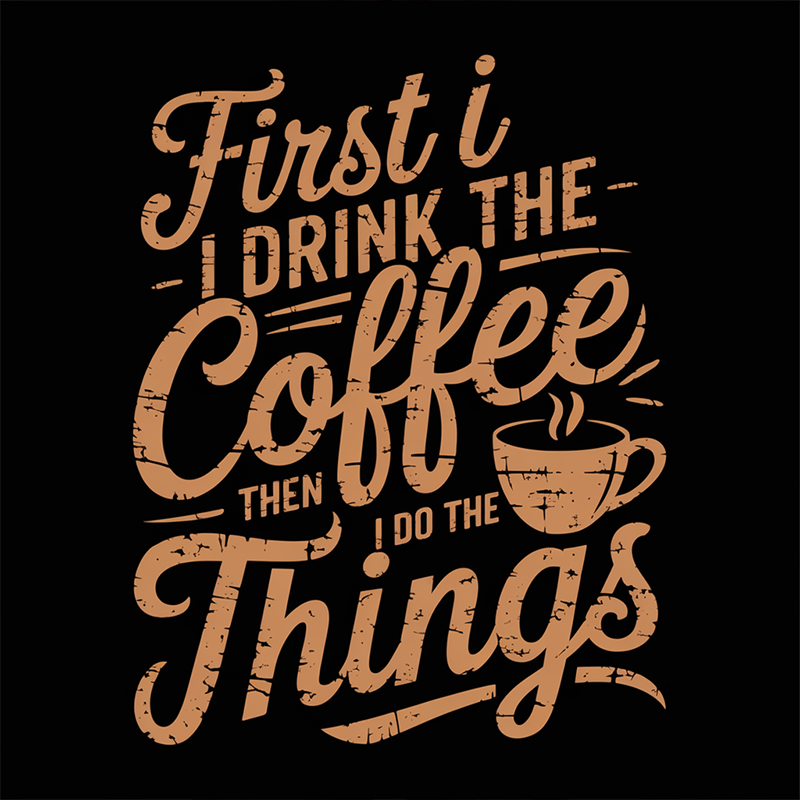 A stylish t-shirt featuring a fun letters pattern and the quote 'First I drink the coffee then I do the things'.