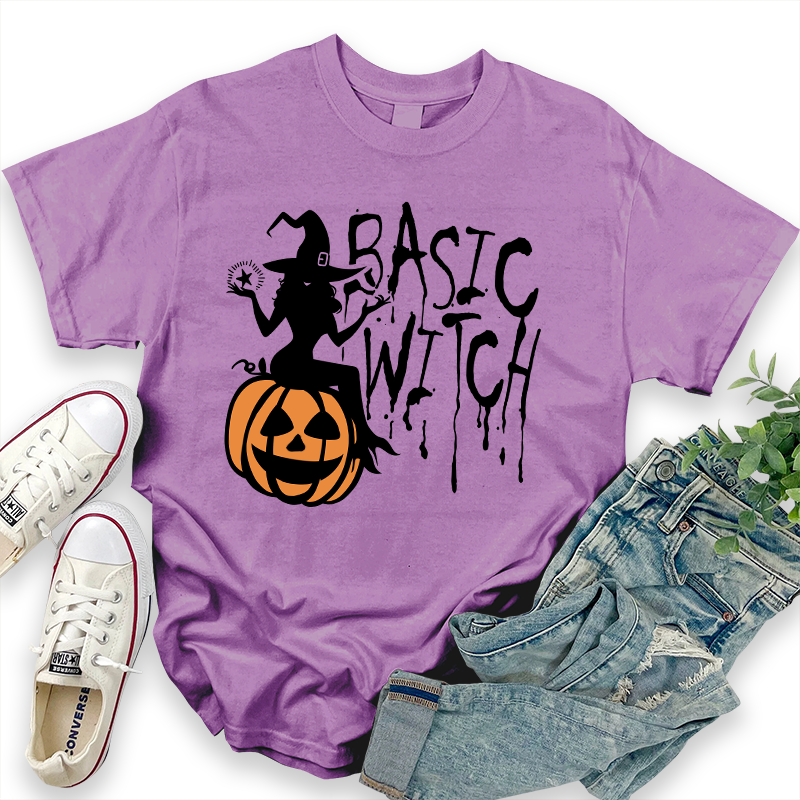 A stylish t-shirt featuring a witch and pumpkinman design, perfect for Halloween or any casual occasion.