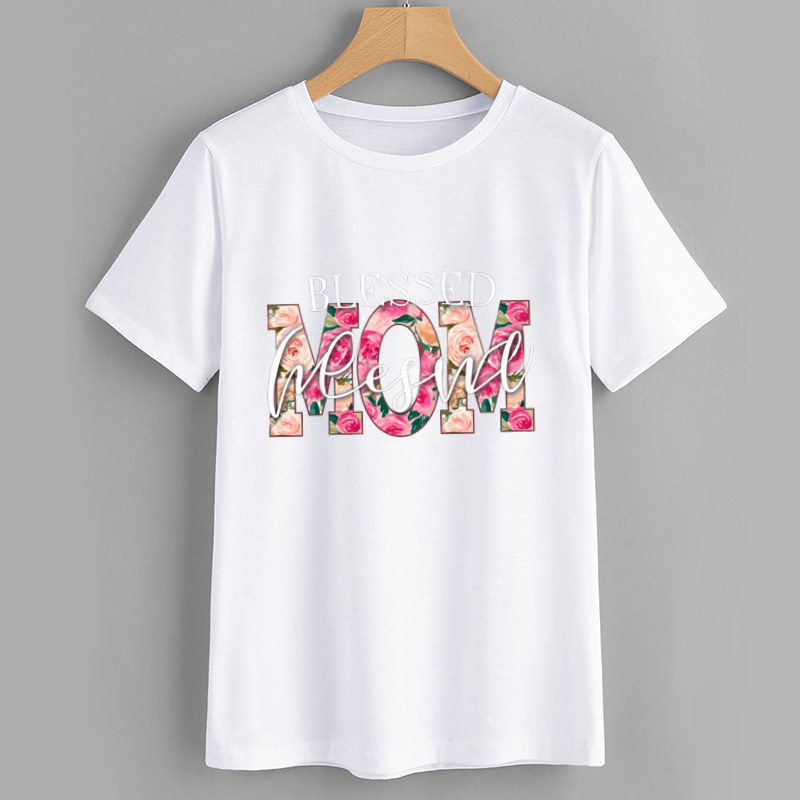 Celebrate love and appreciation with this Blessed Mom Floral Cotton Graphic T-shirt. Crafted from premium, breathable white cotton, this short sleeve tee features a vibrant 'MOM' print filled with beautiful pink and cream roses, accented by the words 'Blessed' and 'Blessed' in elegant script. The comfortable crew neckline and relaxed fit make it perfect for everyday wear or special occasions. Ideal as a thoughtful gift, especially for Mother's Day, this floral print shirt brings a touch of joy and style to any wardrobe. Available in multiple sizes, the eye-catching design measures approximately 10 inches wide on the chest, ensuring a standout look.