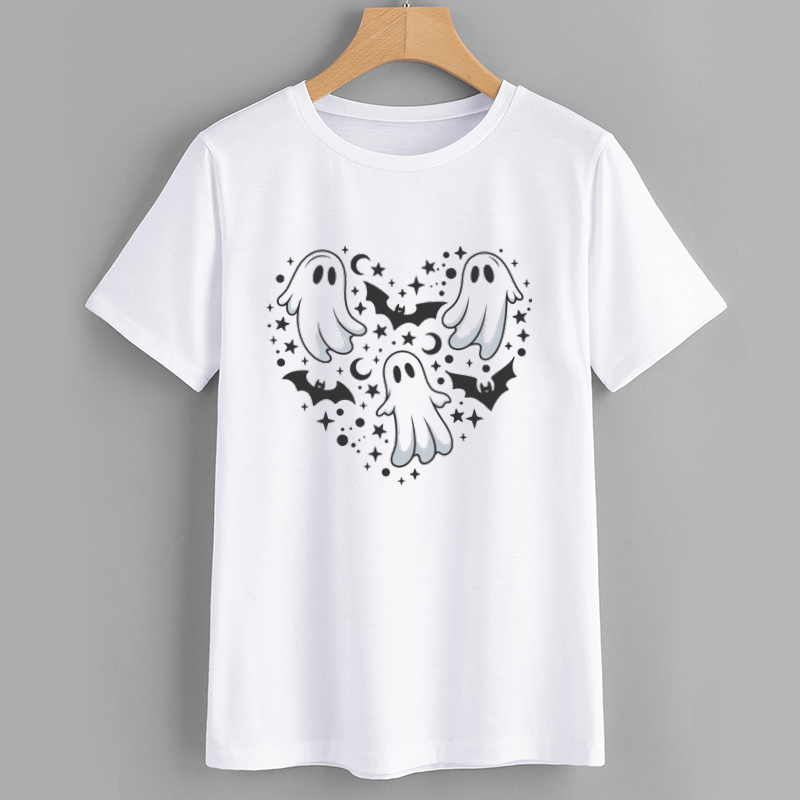 Embrace the spooky season with our Cute Ghosts and Bats Halloween T-Shirt. This white graphic tee features an adorable design of playful ghosts surrounded by bats and stars, perfect for Halloween festivities. Made from soft, breathable fabric, it offers all-day comfort whether you're trick-or-treating or attending a Halloween party. The unique heart-shaped arrangement adds a charming touch to your wardrobe, making this shirt a must-have for any ghost lover. Ideal for casual wear, costume parties, or as a fun gift for friends and family.
