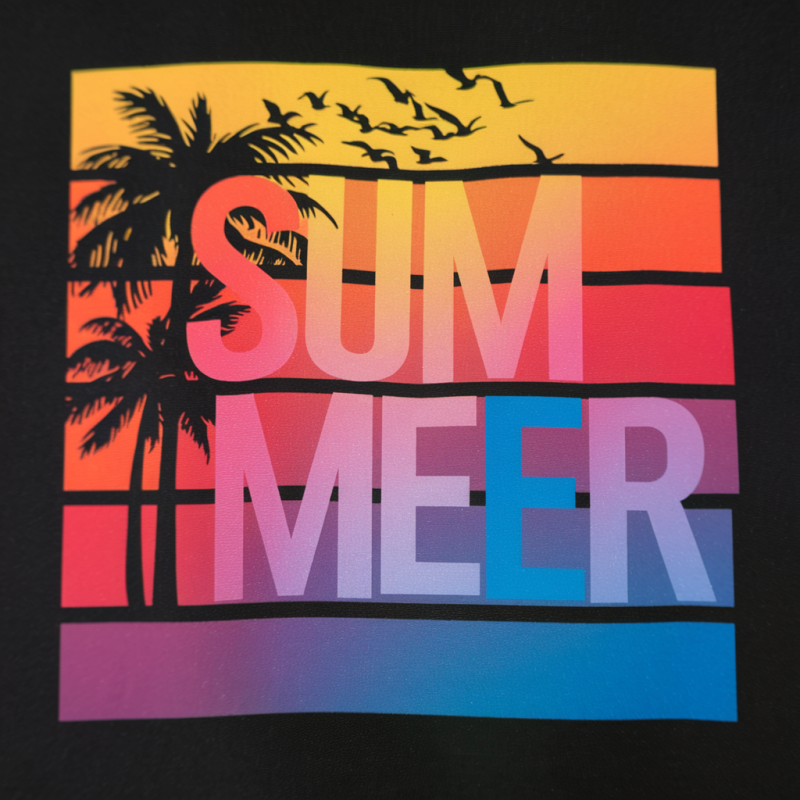 Embrace the summer vibe with this Sunset Palm Graphic Cotton T-Shirt. Crafted from soft, breathable black cotton, this short sleeve tee features a vibrant sunset print in yellow, orange, pink, and blue hues. The bold graphic showcases palm trees, flying birds, and the word 'SUMMER' split across two lines, capturing a relaxed beach scene. Perfect for casual outings, vacations, or beach days, this regular fit t-shirt combines comfort and striking style. Available in multiple sizes, the high-quality print ensures lasting color and appeal.
